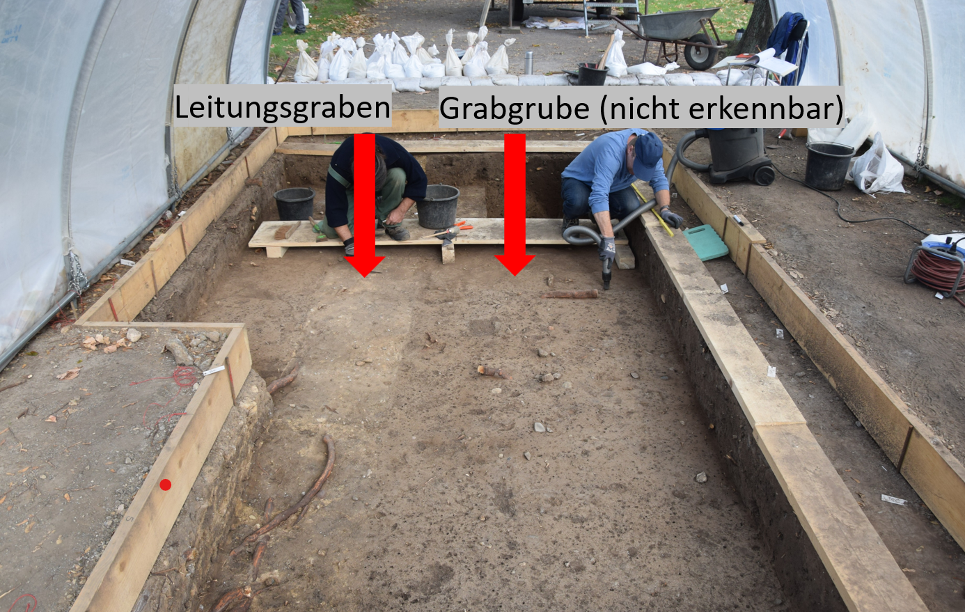 Im Vordergrund stand natürlich die Frage, ob sich trotz der Ausgrabung von 1934 noch Teile der Grabgrube bzw. des Grabes erhalten haben. Und wenn ja, welche Informationen und neuen Erkenntnisse wir zu der Bestattung dazugewinnen können. Zum einen besteht natürlich die Möglichkeit, wenn Teile der Grabgrube erhalten sind, dass auch noch Funde im Boden erhalten sind. Darüber hinaus geben uns Form, Größe und Gestaltung der Grabgrube weitergehende Informationen, wie beispielsweise die Bestattung abgelaufen ist.