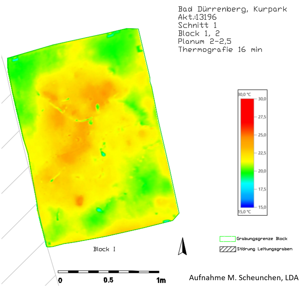 Wenn wir beispielsweise annehmen, dass beim Ausheben einer Grube der natürliche Aufbau der Bodenstruktur zerstört wird und sich das anhand der Verfärbung nicht mehr greifbar machen lässt, so bleiben doch diese Unterschiede in der Bodenzusammensetzung erhalten. Wenn wir beispielsweise eine Thermographie, also eine Wärmebildaufnahme einer vorher aufgeheizten Fläche machen, dann ist es so, dass unterschiedliche Sedimente unterschiedlich in ihrer Zusammensetzung verschieden Erwärmen und Abkühlen. Und wir bekommen dann ein Bild von den Strukturen im Boden, aber halt als Fehlfarbenbild.