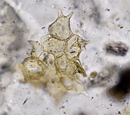Das war schon ziemlich schwierig, dort Pollen zu extrahieren, weil die Grabgrube ja eine Trockenbodenerhaltung ist. Das heißt, der Boden war über viele Tausende Jahre gut durchlüftet. Pollen sind relativ komplex aufgebaut und sie haben eine sehr, sehr stabile Außenhülle, die sogenannte Exine. Man kann sich das wie ein Chitin-Skelett bei Insekten vorstellen. Und das ist gegen ganz viele Umwelteinflüsse sehr resistent. Wenn ich die Pollen unter Luftabschluss, unter Wasser in Moorablagerungen aufbewahre, dann sind die also unglaublich lange, sogar über Millionen Jahre, haltbar. Das Einzige, was diese Exine auffrisst, das ist Sauerstoff. Das heißt, dass viel von dem Pollenmaterial oxidiert ist, zerstört ist. Ich muss gestehen, ich wollte eigentlich aufgeben, weil die Ergebnisse statistisch überhaupt nicht auswertbar waren. Aber es hat sich dann gezeigt, dass im Bereich des Schädels ein bisschen mehr Pollen erhalten geblieben sind. Und das waren einerseits Pollen von optisch attraktiven Blütenpflanzen. Und es gab, das war eigentlich sehr, sehr spannend, Grünalgenzellverbände. Und damit hatte ich überhaupt nicht gerechnet, weil in einer Trockenbodenablagerung haben die eigentlich nichts zu suchen. Die Frau Kirkinen hat Mikroreste von Federn von Wasservögeln, von Gänsen gefunden und das ist für mich durchaus vorstellbar, dass in dem Gefieder sich Algen verfangen haben. Diese Federn sind dann wie auch immer ins Grab gelangt und mit viel Glück und Zufall sind die Grünalgen in dem Gefieder erhalten geblieben.